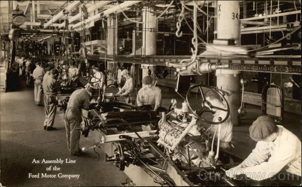 The assembly line centered around a conveyor belt, at which each worker would be placed at a designated position and repeat the same task for their entire shift. Each position along the belt served a predetermined task progressing toward final, completed automobile.